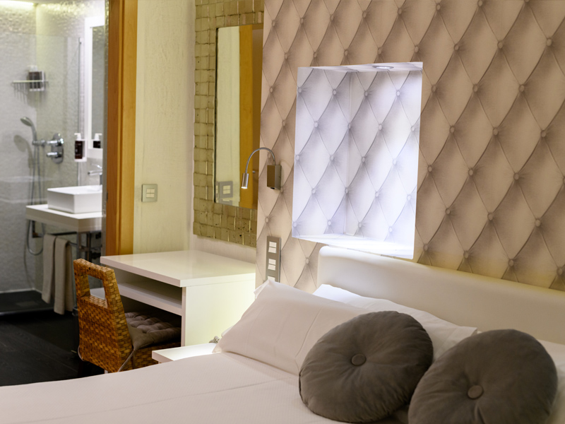 Esta habitación doble estándar, ubicada en la planta primera del hotel, se caracteriza por las armonías de su decoración basada en el color blanco. Es una habitación interior con ventana con vistas al patio del hotel.