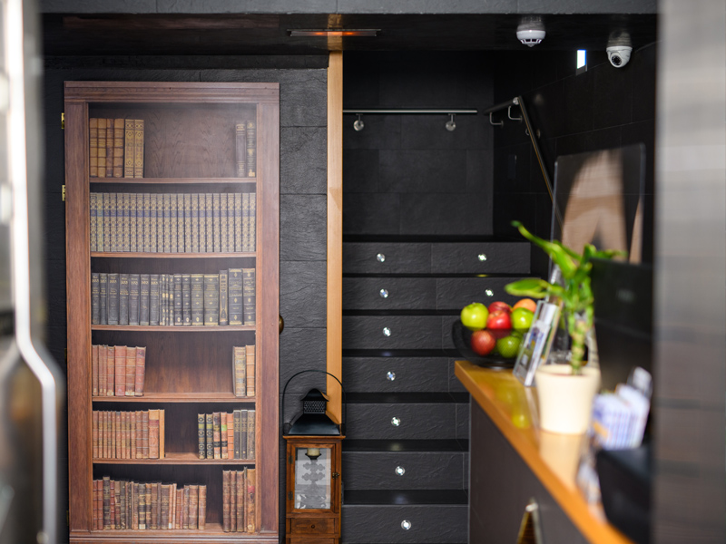 Sala común con biblioteca y sofás